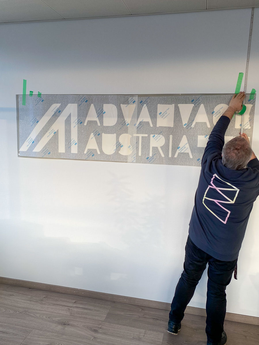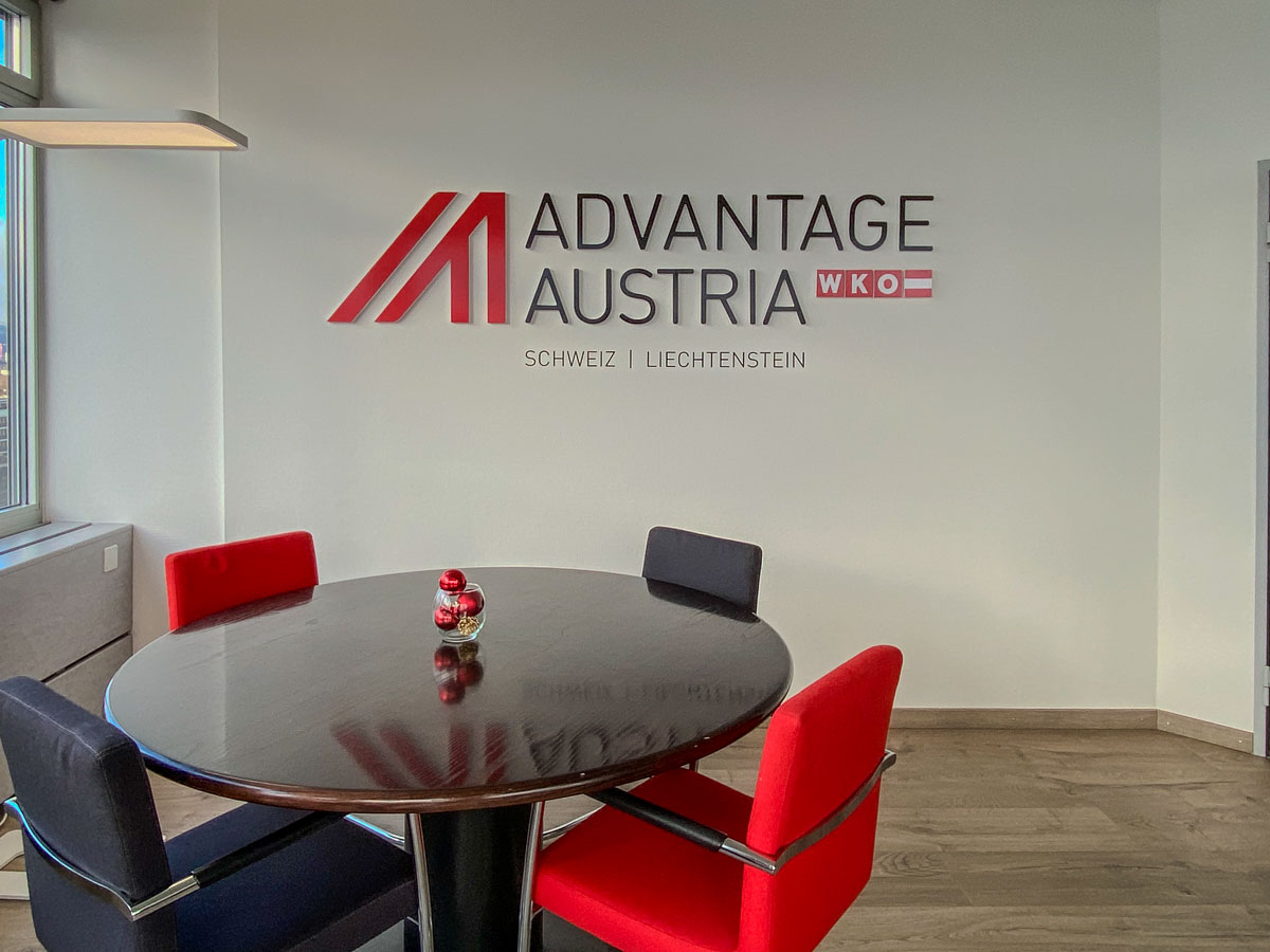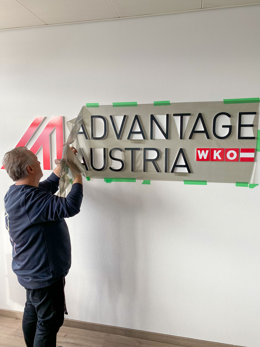 Ein besonderes Highlight war der starke 3D-Effekt: Durch die Tiefe des Materials heben sich die einzelnen Elemente deutlich von der Wand ab und erzeugen so ein plastisches, modernes Erscheinungsbild. Gerade im Meetingraum, wo Besucher und Partner empfangen werden, hat dies eine repräsentative Wirkung. Das Logo vermittelt Seriosität, Professionalität und Markenbewusstsein – Werte, die für Advantage Austria von zentraler Bedeutung sind.