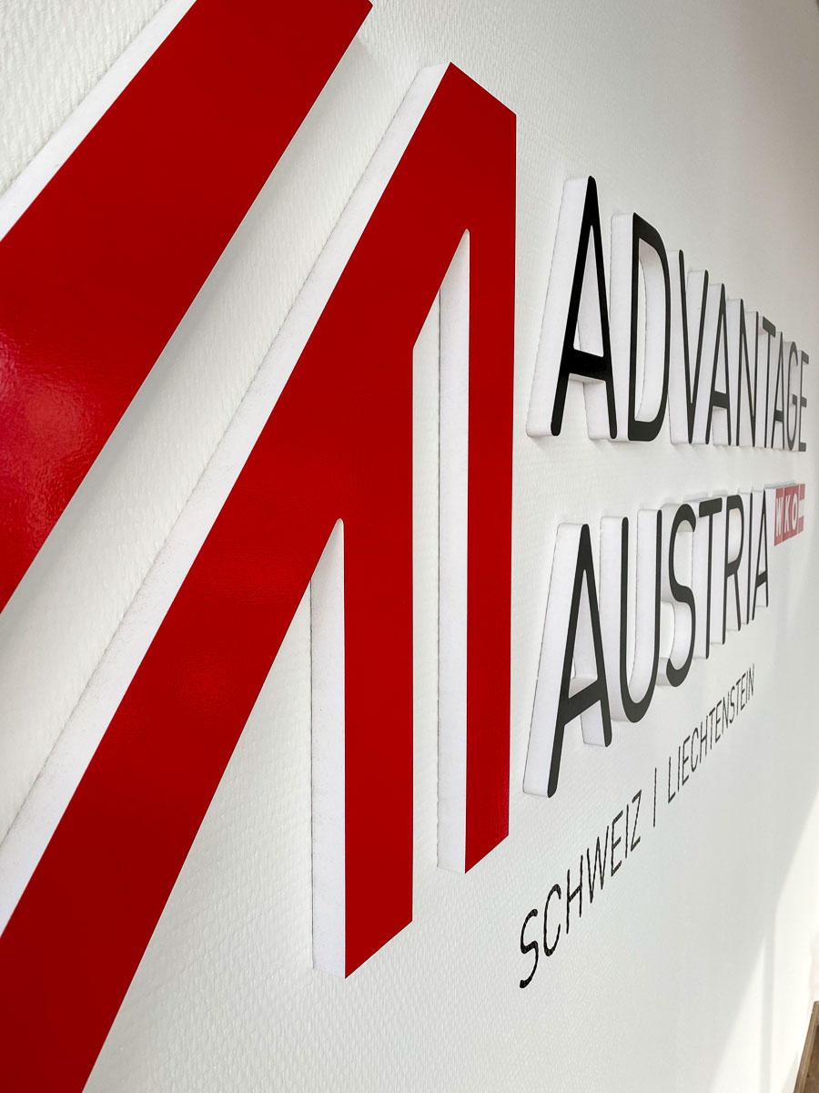 Das 3D-Firmenlogo für Advantage Austria in Zürich zeigt eindrucksvoll, wie ein Logo zur repräsentativen Raumgestaltung beitragen kann. Mit hochwertiger Verarbeitung, starkem 3D-Effekt und präziser Montage entsteht ein Markenauftritt, der nachhaltig wirkt. Gerade in Meetingräumen oder Empfangsbereichen ist ein 3D-Logo die ideale Lösung, um Professionalität und Markenbewusstsein zu unterstreichen. Wenn du deine Marke eindrucksvoll inszenieren willst, dann ist ein massgeschneidertes 3D-Firmenlogo in Zürich die perfekte Möglichkeit, ein starkes und nachhaltiges Statement zu setzen – und deine Räume in echte Markenwelten zu verwandeln.