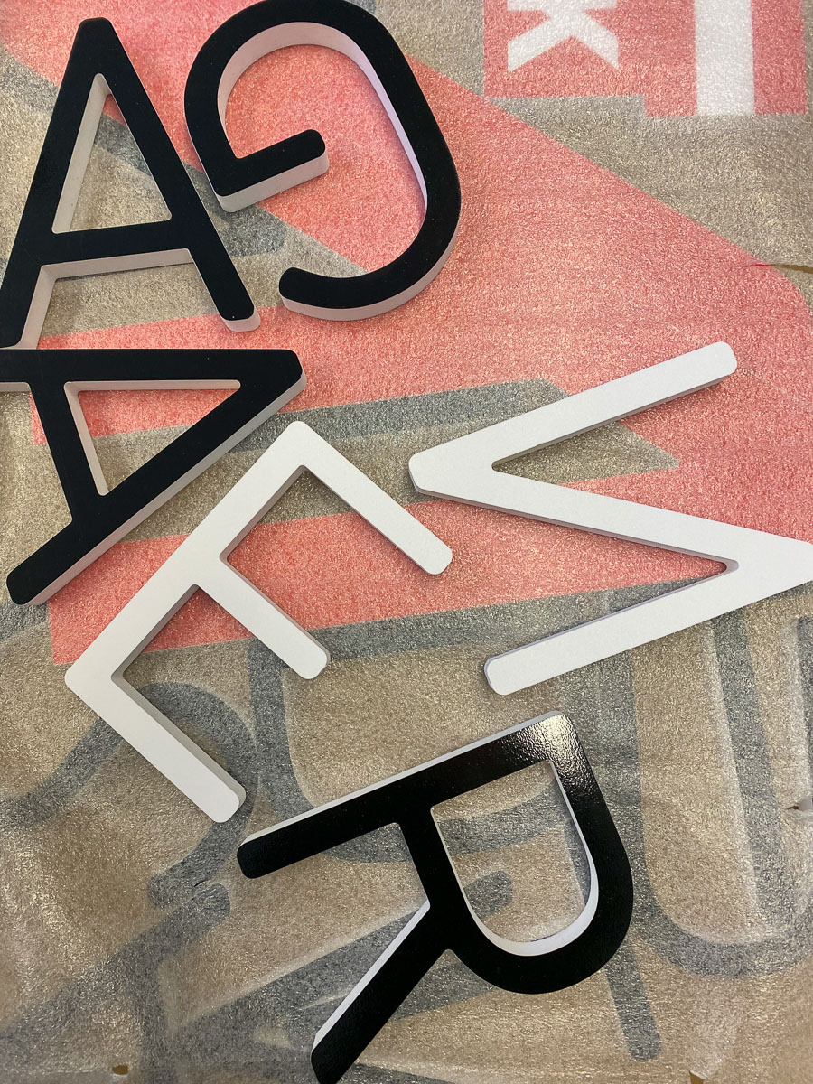 Die Ausführung erfolgte mit einer 19 mm dicken Hartschaumplatte, die präzise ausgefräst wurde. Jedes Element – von den Buchstaben bis zu den grafischen Symbolen – wurde anschliessend mit bedruckter PVC-Folie überzogen. Ein zusätzliches Glanzlaminat verstärkte die Wirkung, indem es für brillante Farben und eine elegante Oberfläche sorgte. Diese Kombination aus Material und Verarbeitung bringt nicht nur einen edlen Look, sondern auch eine lange Haltbarkeit.
