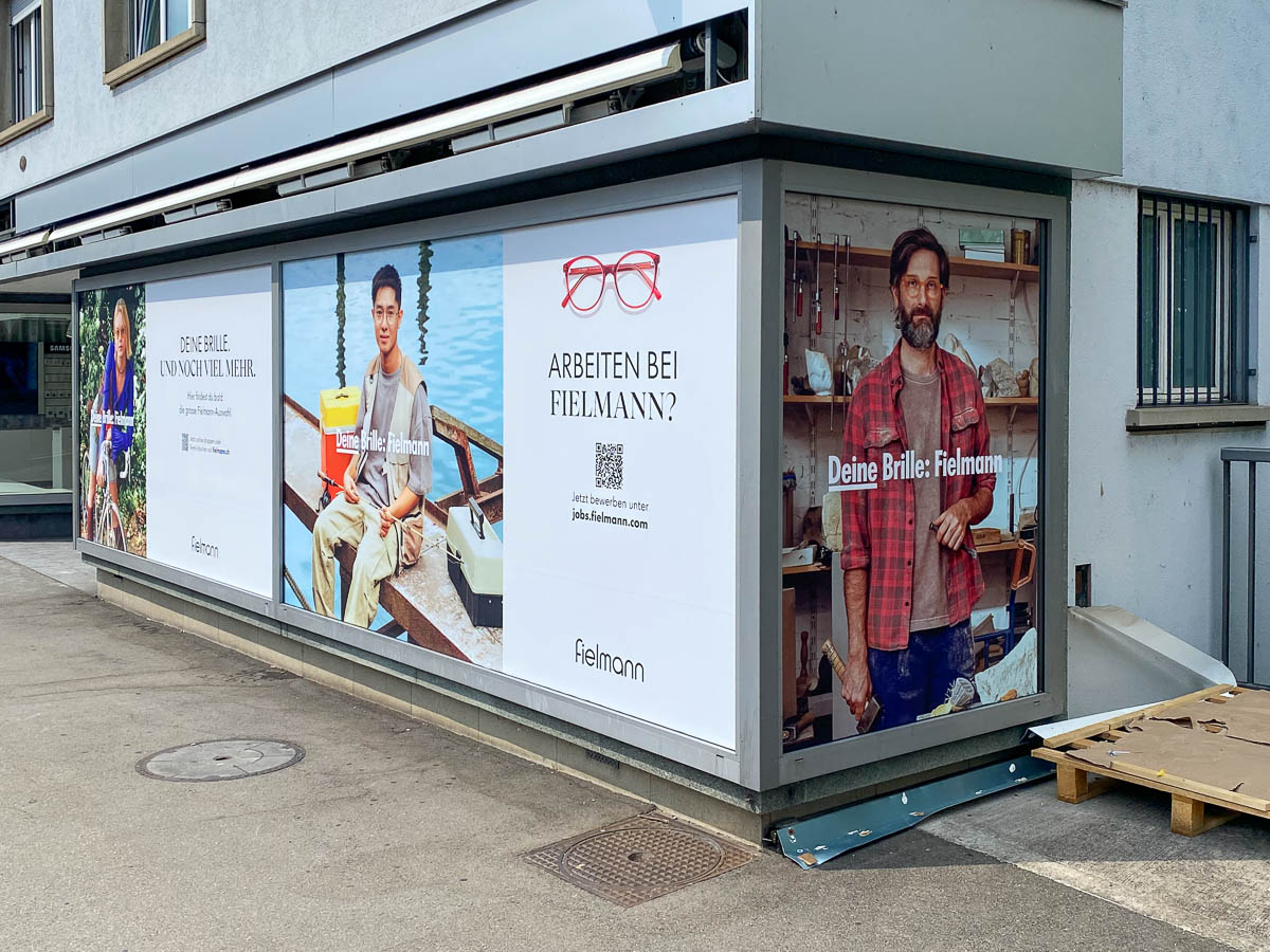 Für die Umsetzung kamen bedruckte Premiumfolien zum Einsatz, die zusätzlich matt laminiert wurden. Dieses Laminat verleiht der Oberfläche ein edles Finish und reduziert gleichzeitig störende Spiegelungen. Zudem schützt es den Druck zuverlässig vor Kratzern und Witterungseinflüssen – ein wichtiger Aspekt, wenn Folien über mehrere Monate hinweg im Aussenbereich eingesetzt werden.